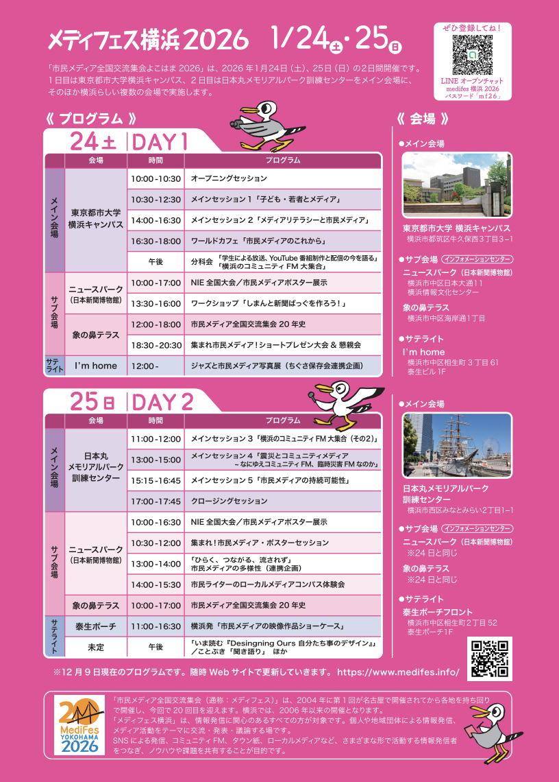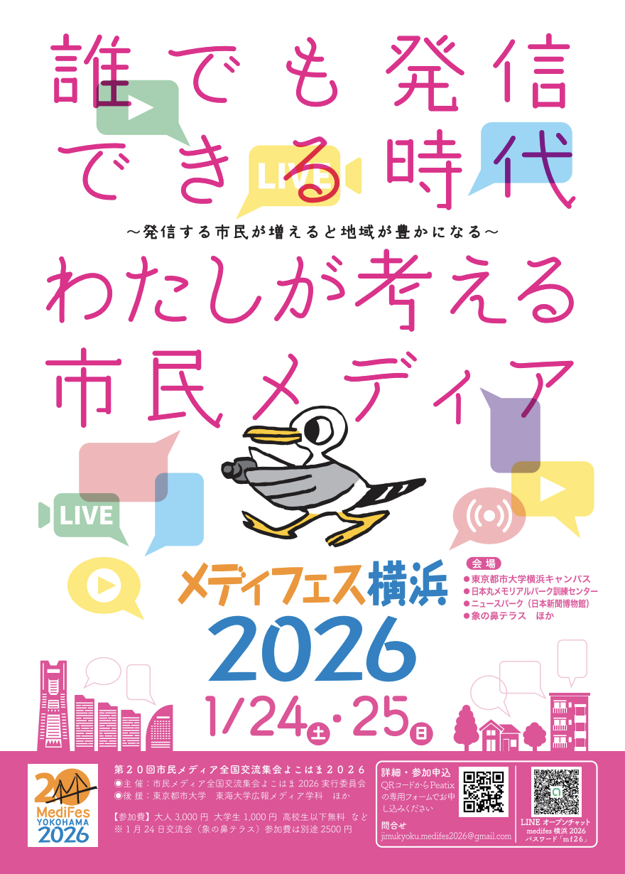 2026年1月24日(土)・25日(日)の2日間、横浜市内の複数拠点を舞台に「第20回 市民メディア全国交流集会よこはま2026」(通称:メディフェス横浜2026)が開催される。